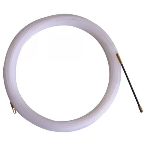 Kábelbehúzó 20m vezeték behúzó szalag műanyag 4mm átmérőjű műanyag szalag Kiváló hajlási és csúszási tulajdonságok, a vezetőfejen nagy szem található, melynek segítségével akár 7 x 2,5 mm vezeték is behúzható.