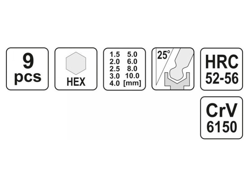 Az Allys keménysége 52-55 HRC. Kulcsok: 1.5 mm 2.0 mm 2.5 mm 3.0 mm 4.0 mm 5.0 mm 6.0 mm 8.0 mm 10.0 mm